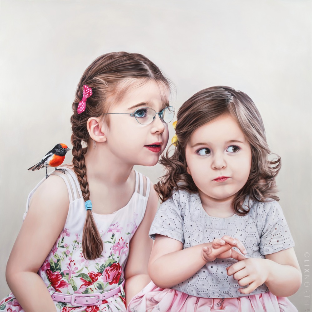 'A Little Bird Told Me' chronicles the special bond between young siblings, Zara and Eve. Birds have developed into an integral part of my work over the last few years, so in this work I employed particular feathered fellow, a native Australian Red-Capped Robin, as the operative device and the origin of the shared secrets whispered between his two little friends.